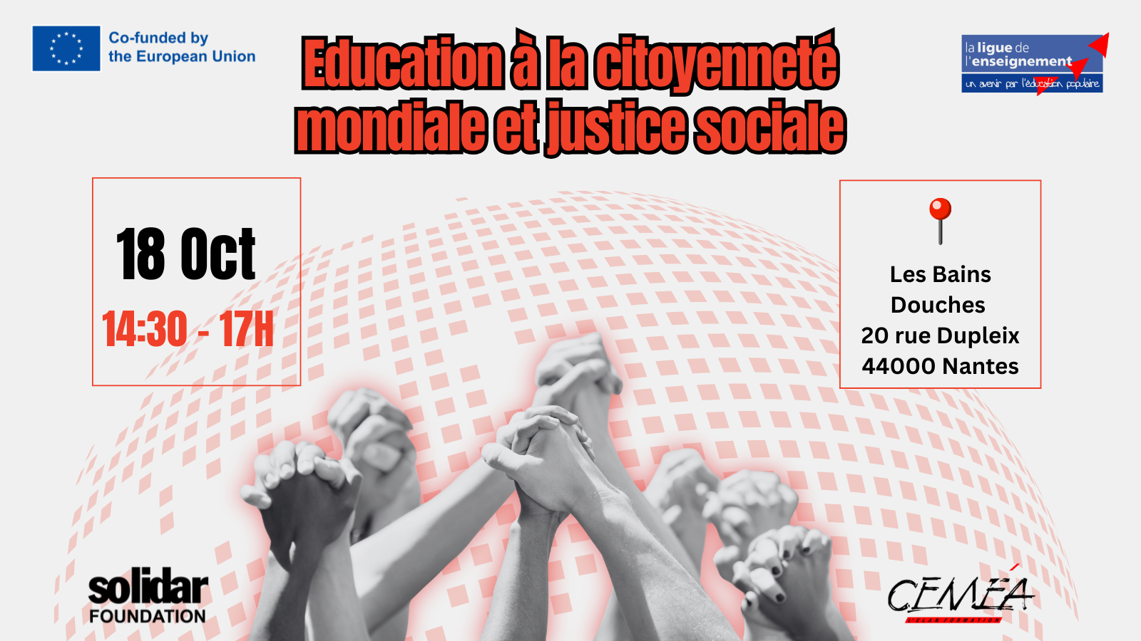 Cette journée est organisée par les Ceméa Pays de la Loire, La Ligue de l’Enseignement 44 et Solidar. Solidar a produit une étude dans 10 pays européens et des recommandations sur l’éducation à la citoyenneté mondiale (Manifest). La journée portera sur l’accès à l’éducation à la citoyenneté pour tous et toutes et les enjeux de justice sociale....